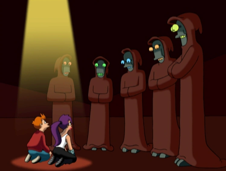 Após fazerem uma alusão as drogas, definindo "eletricidade" como uma droga de robôs, o vicio de Bender o leva a usar a religião robótica como meio de se perdoar (fazendo muitas sátiras a religião).